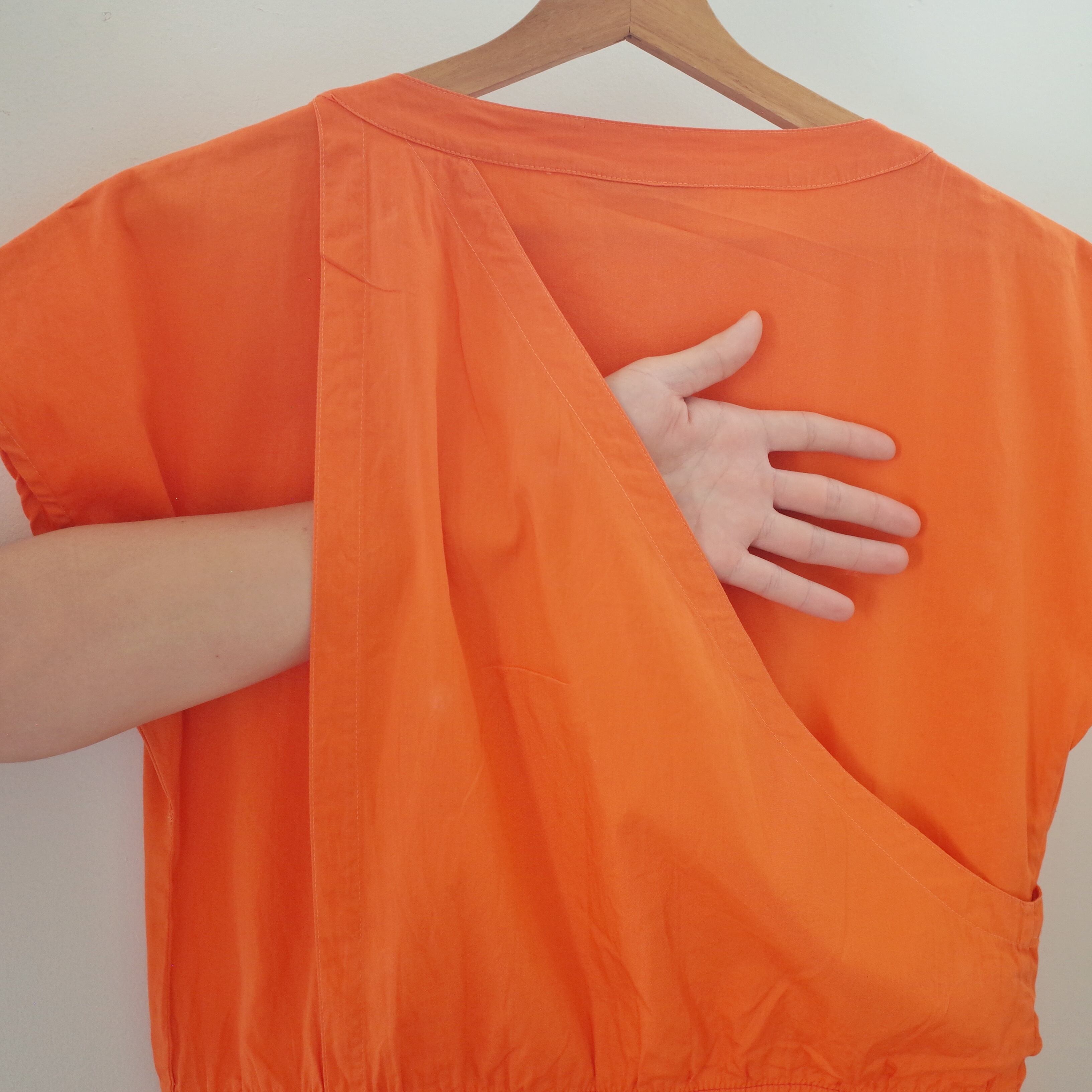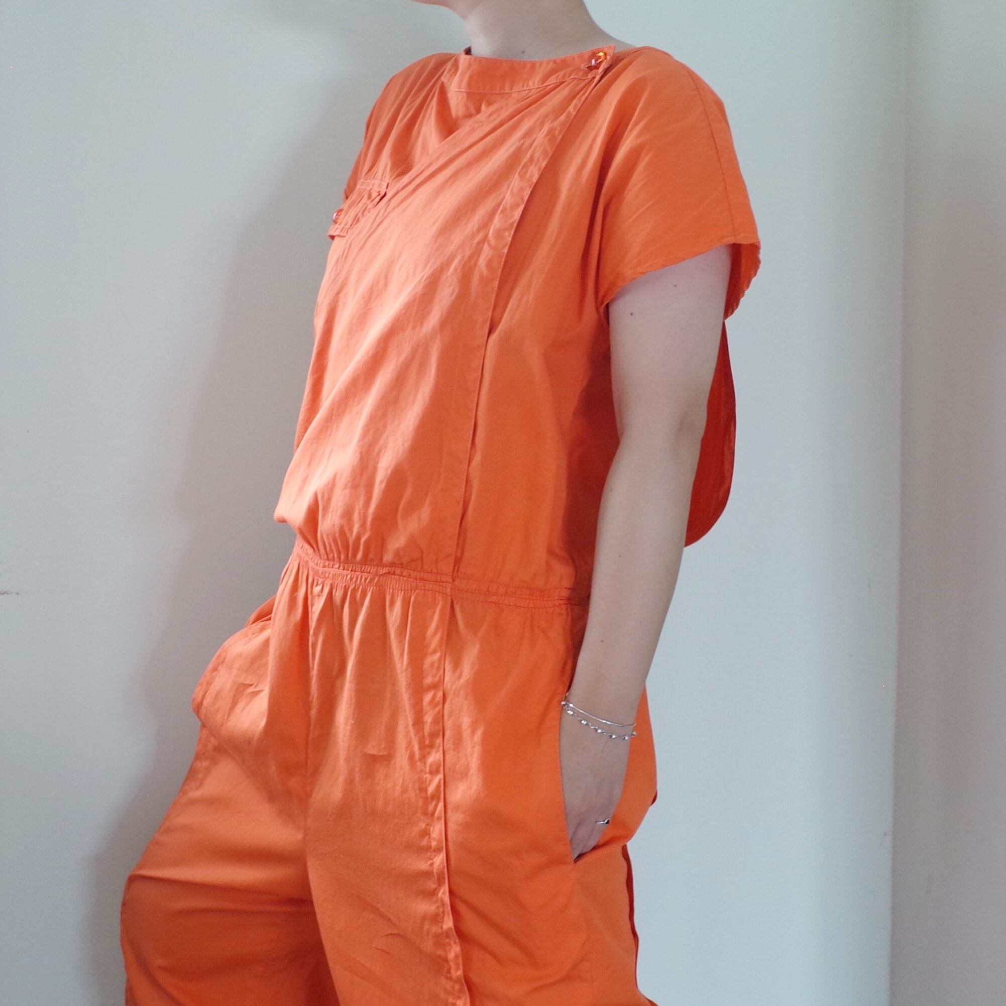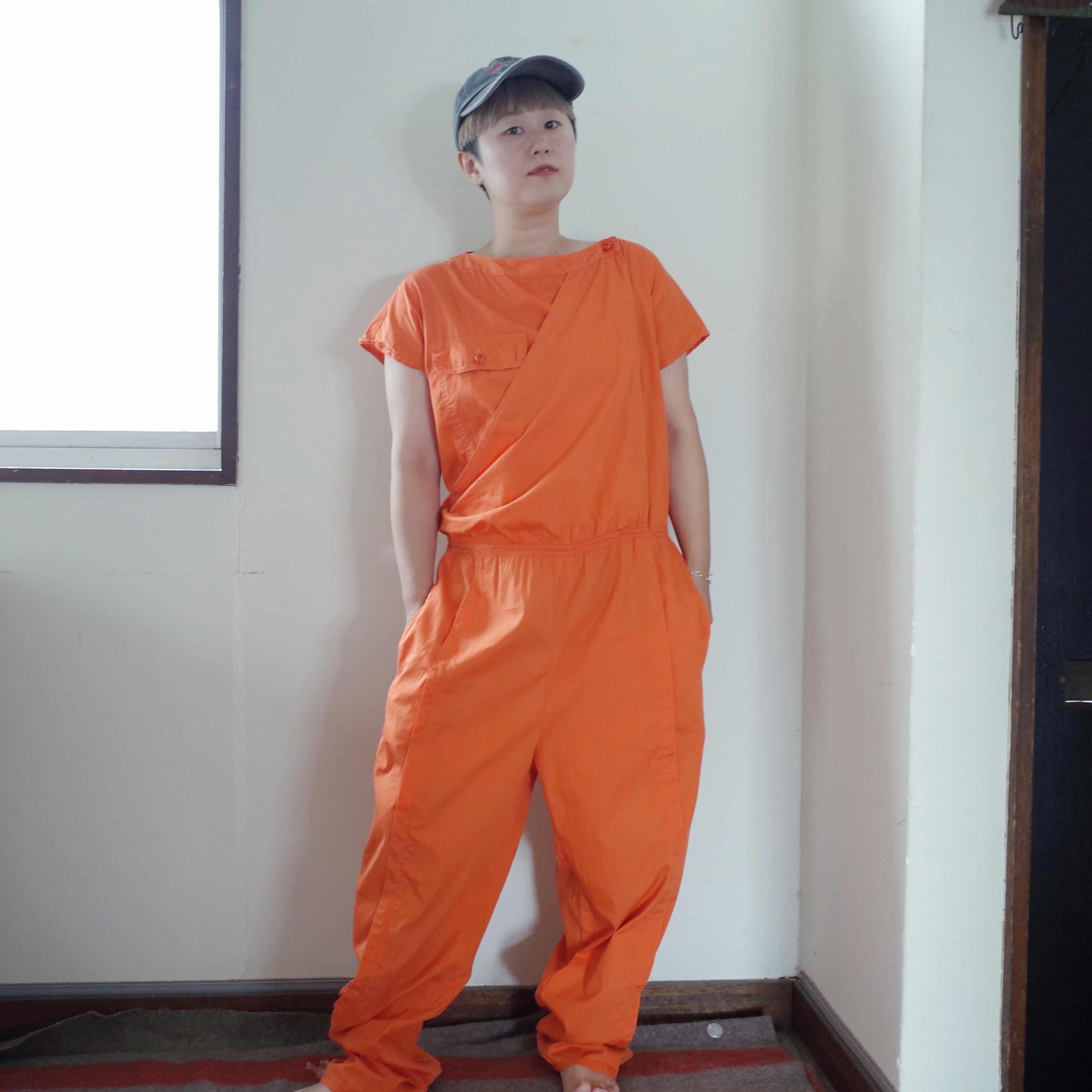 鮮やかなオレンジ色の半袖ジャンプスーツ。