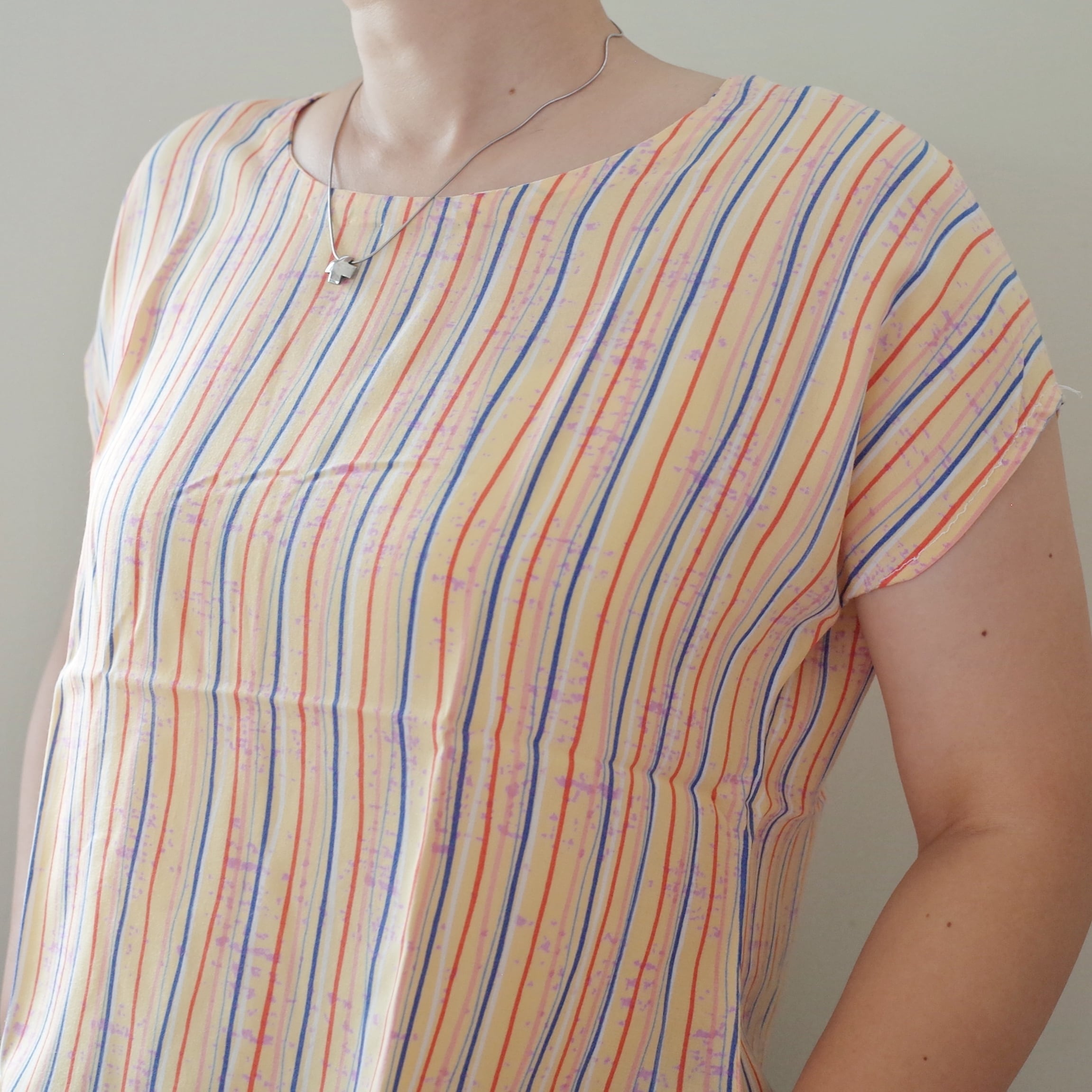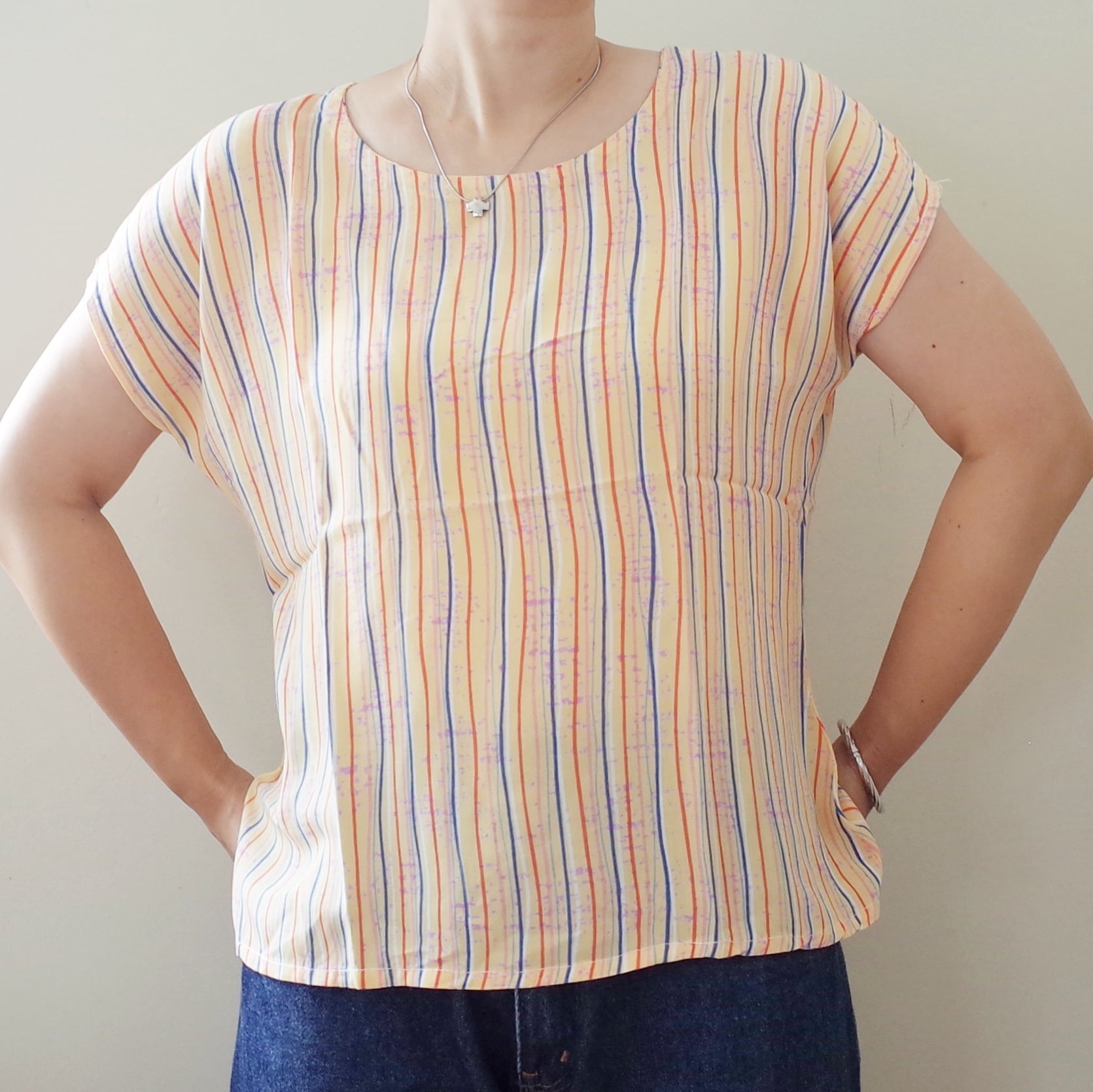 イエローベースにオレンジやブルーの細いストライプとピンクの絵の具を散らしたようなテキスタイルがとっても可愛いです。