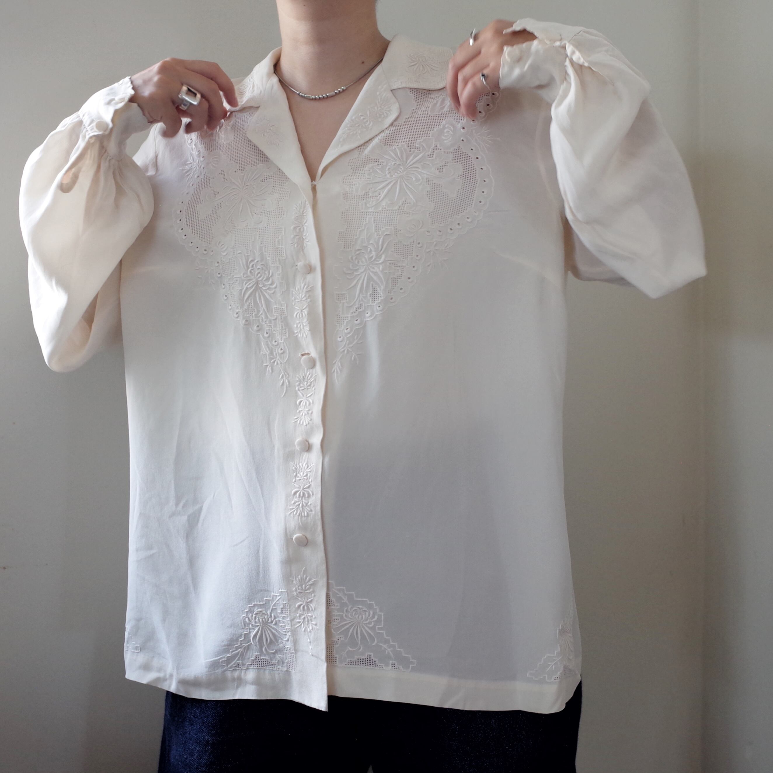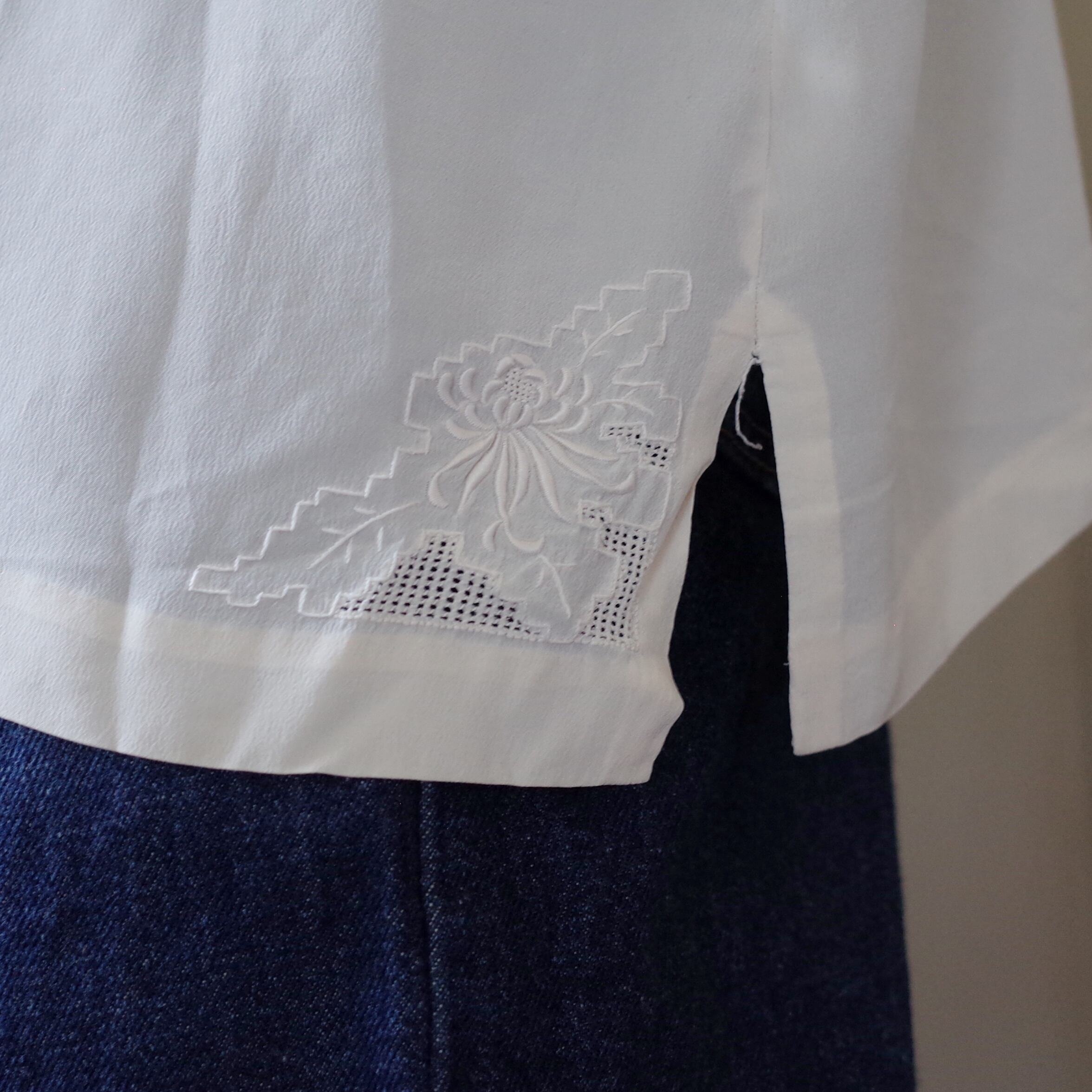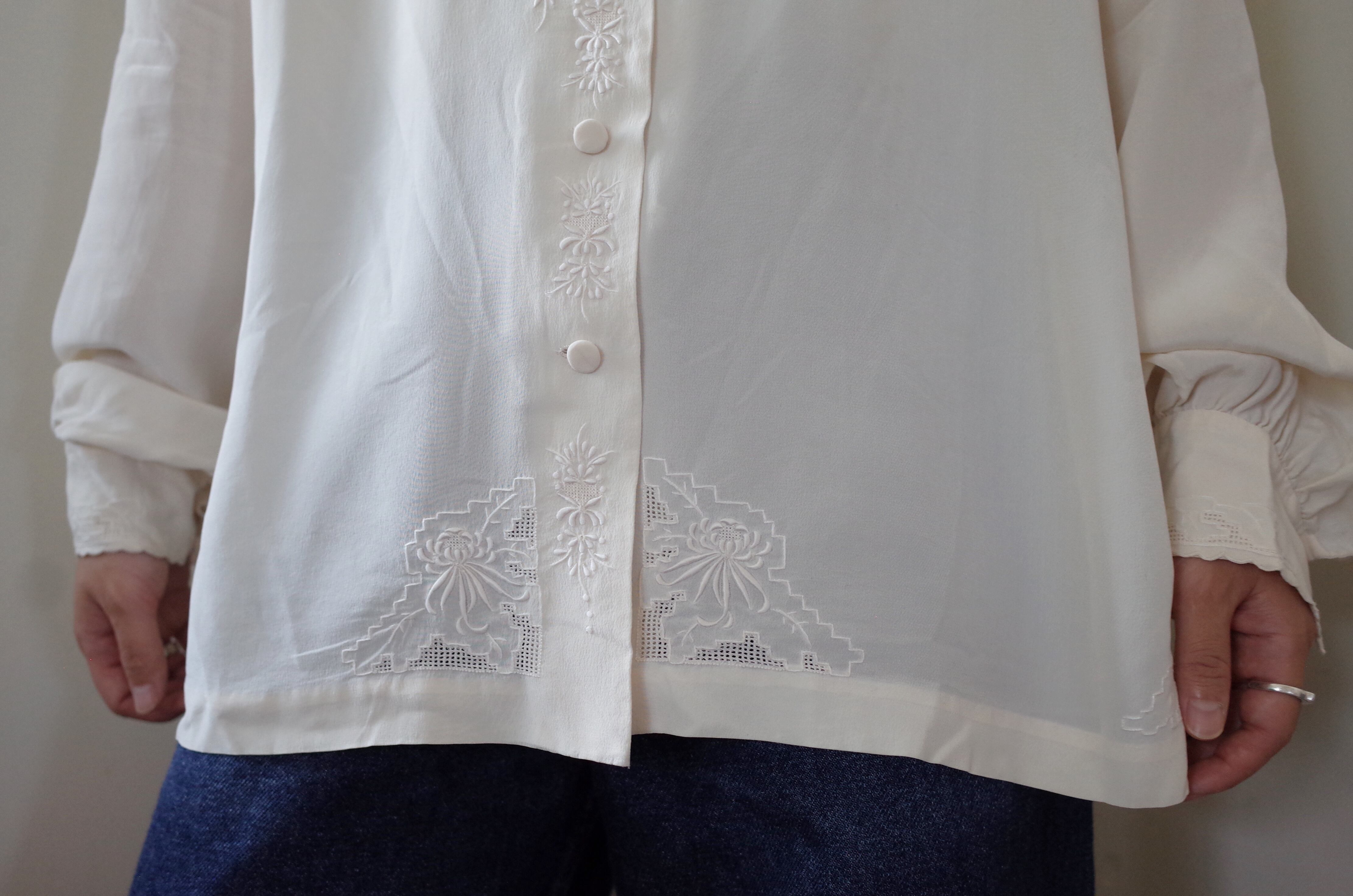 汕頭刺繍のブラウスは細身なシルエットのものが多い中、比較的ボリュームがありゆったりと着られる少しレアなアイテムです。