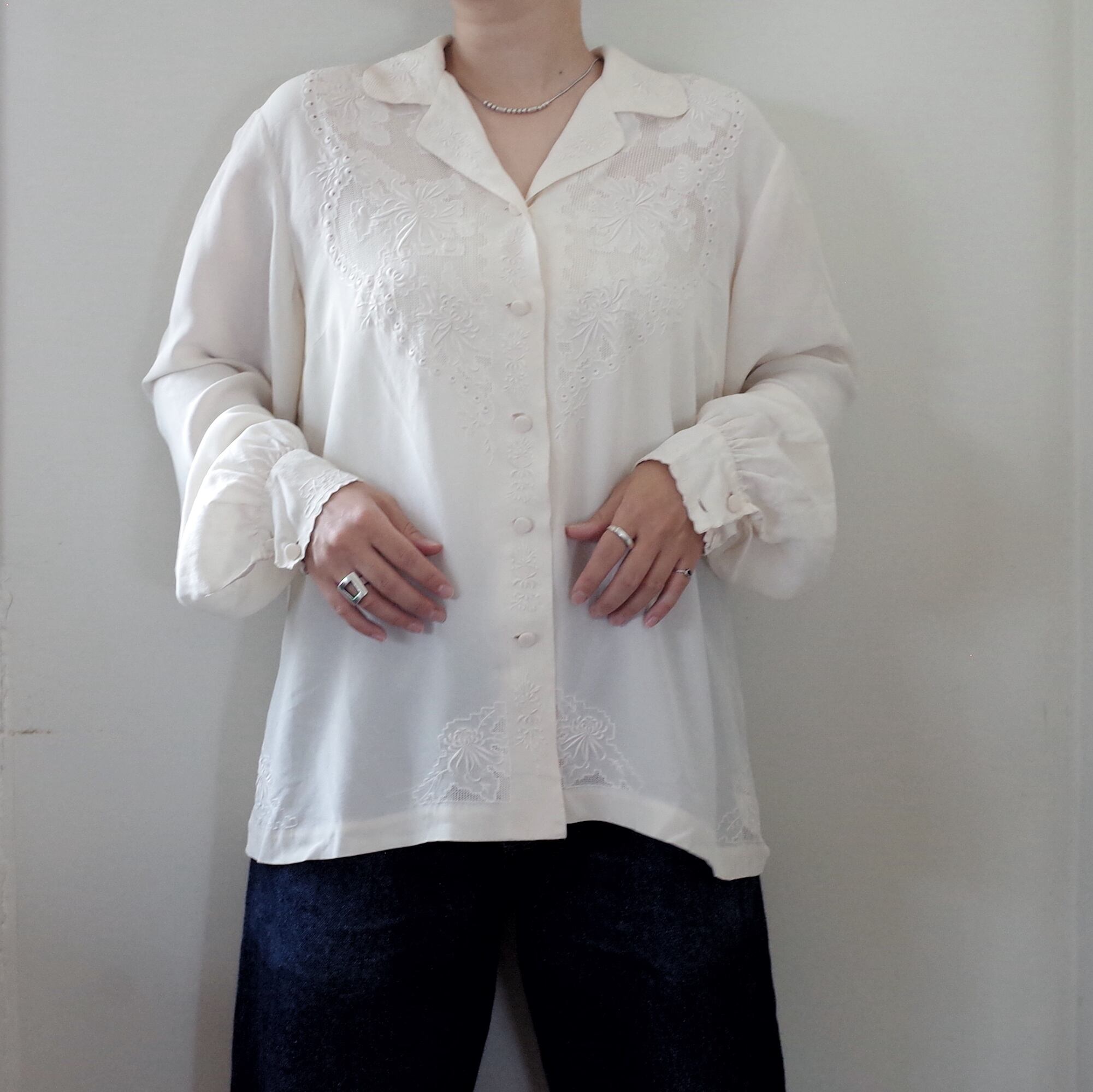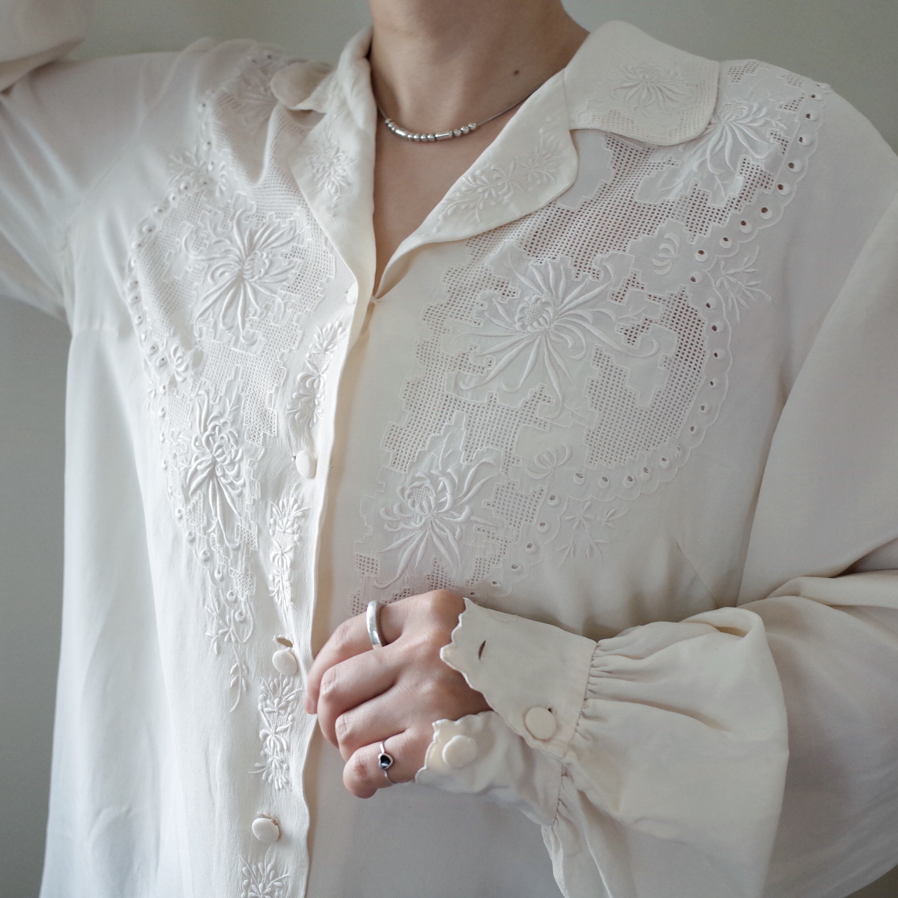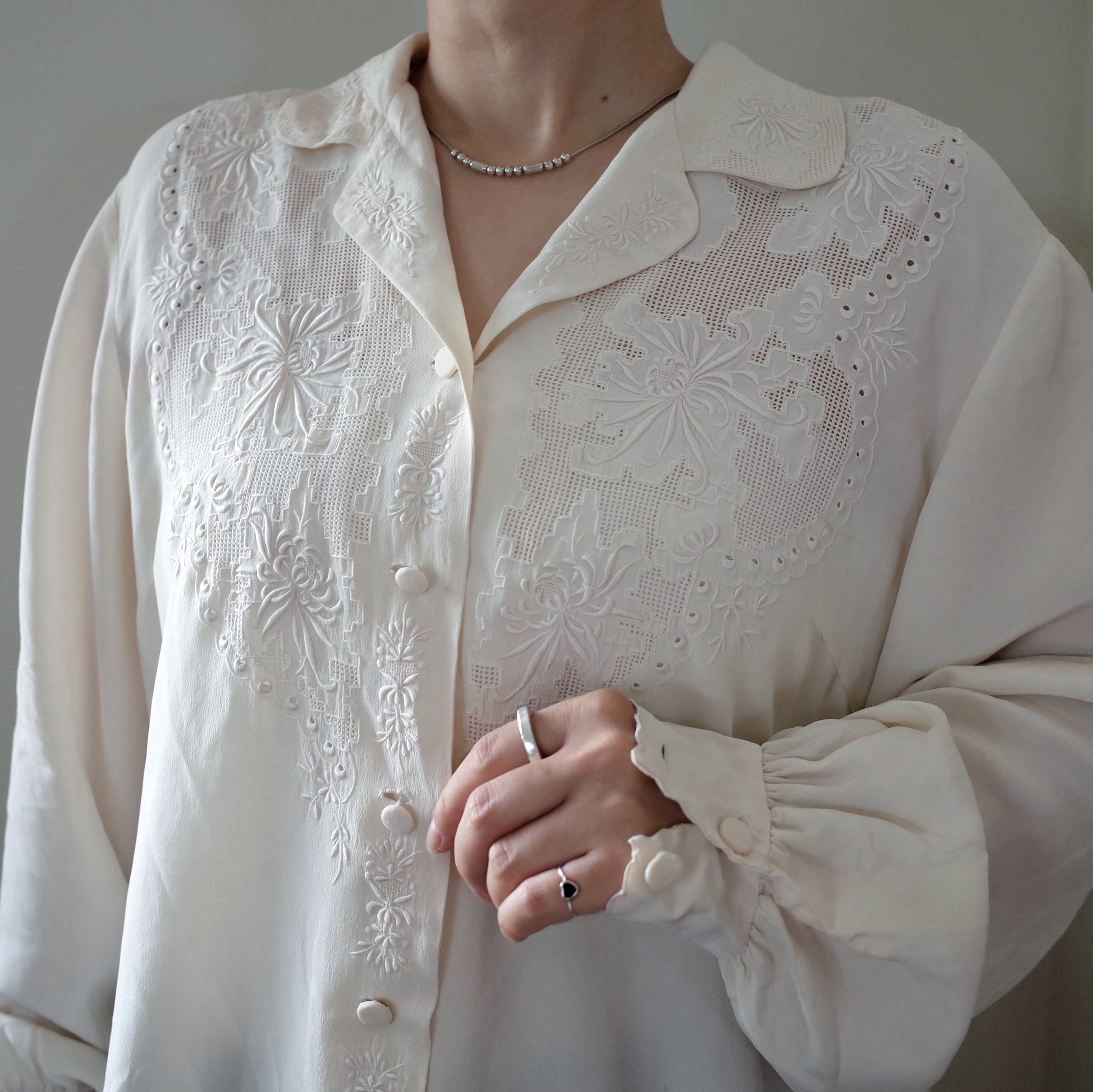 汕頭刺繍のブラウスは細身なシルエットのものが多い中、比較的ボリュームがありゆったりと着られる少しレアなアイテムです。