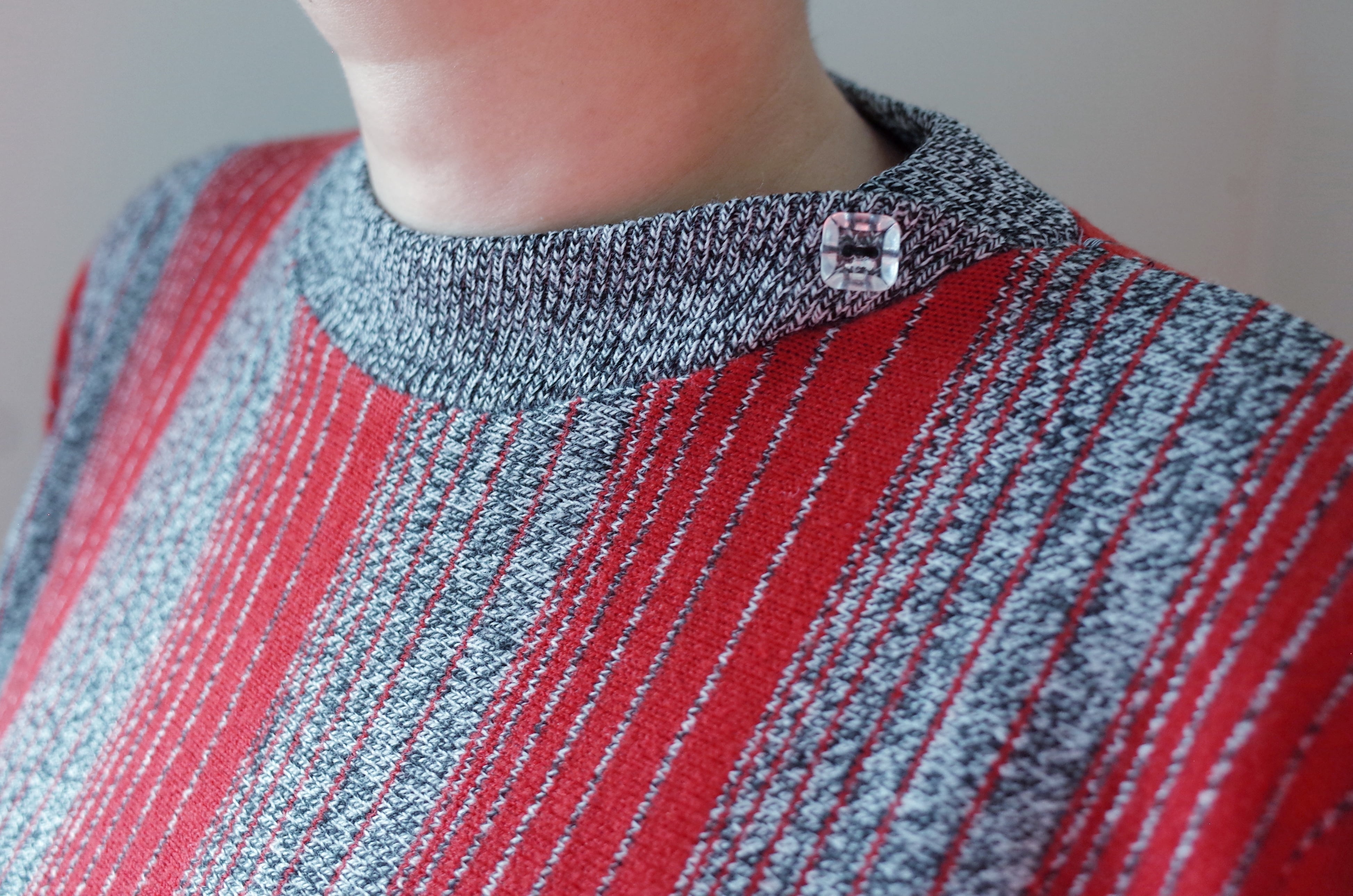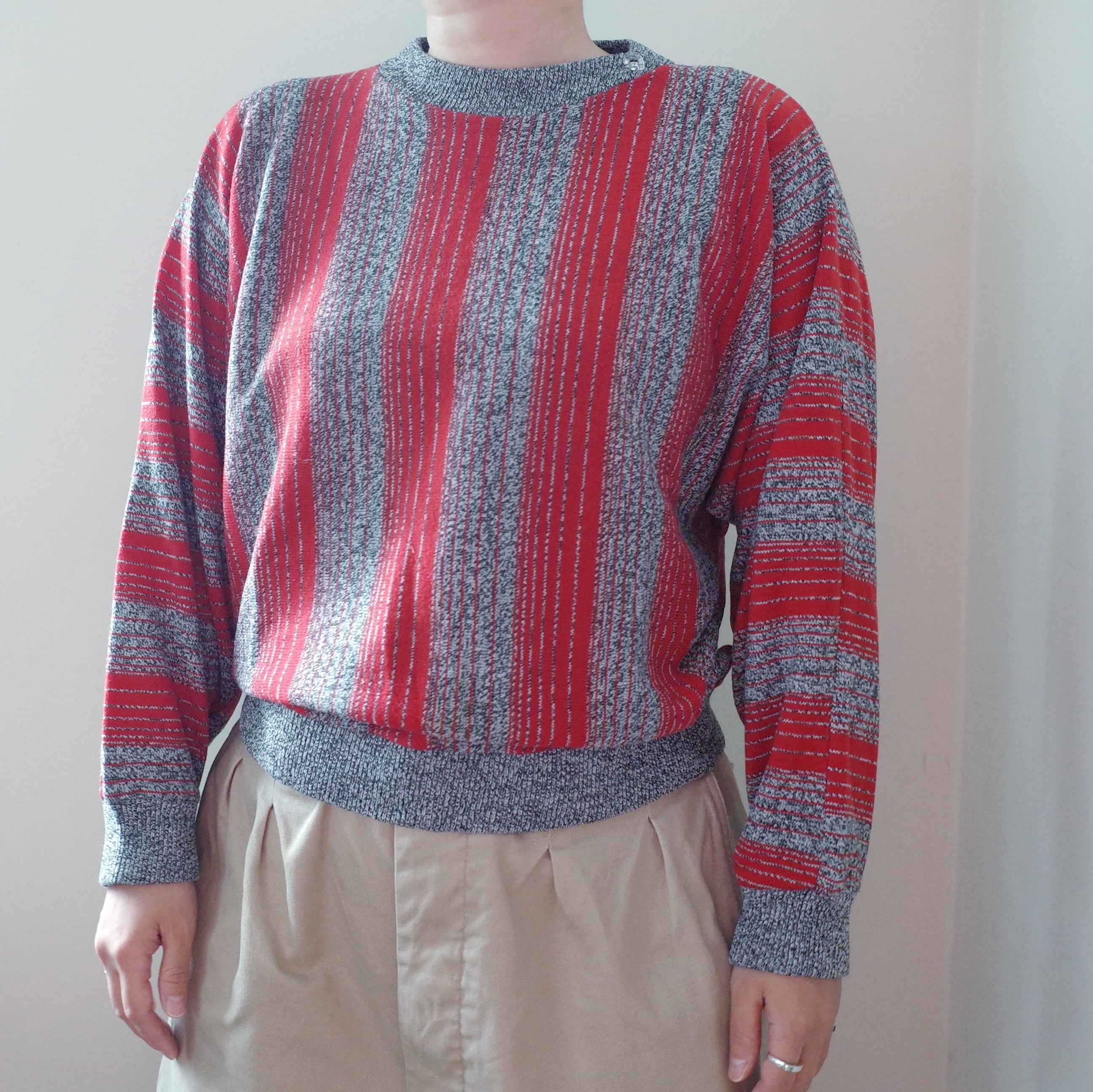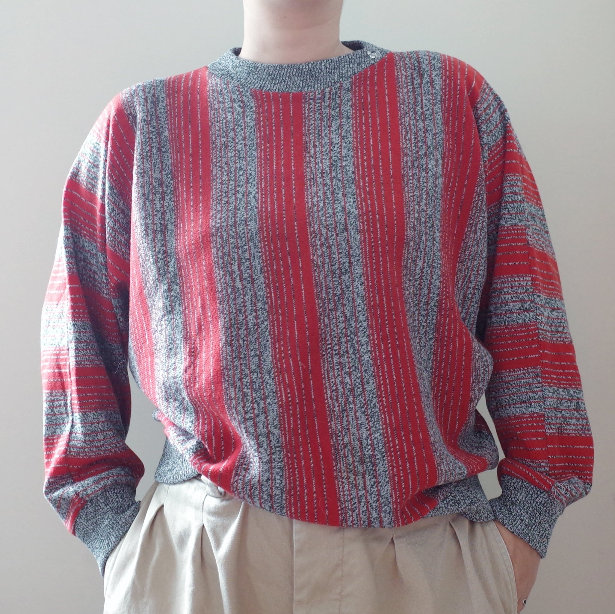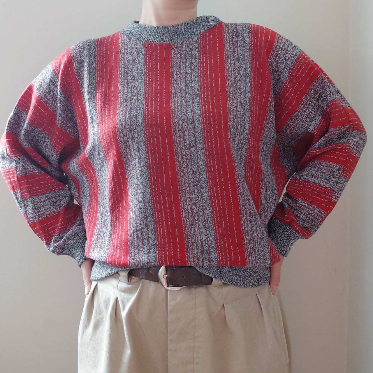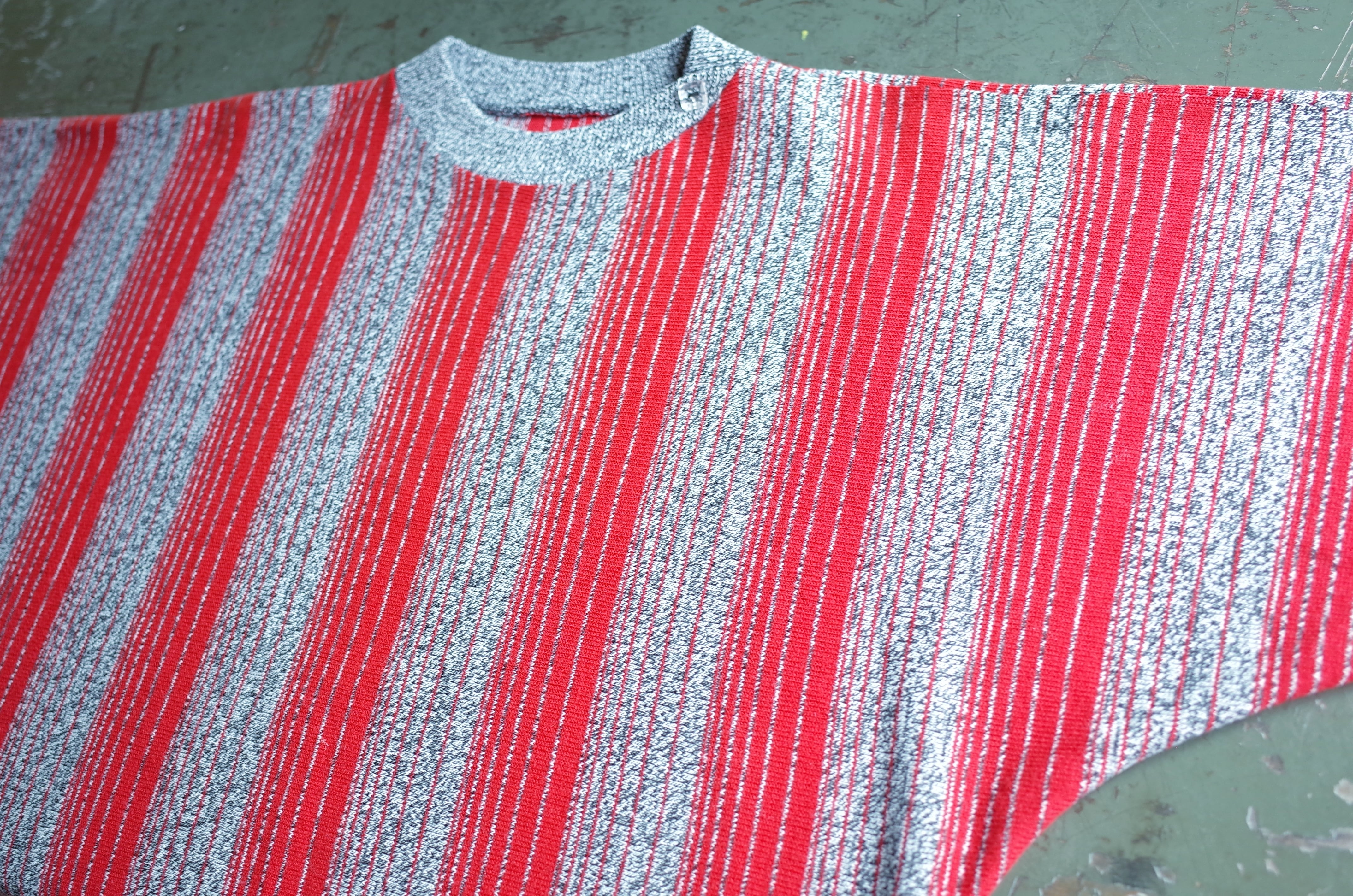 霜降りのグレーをベースに赤いラインのストライプ柄。