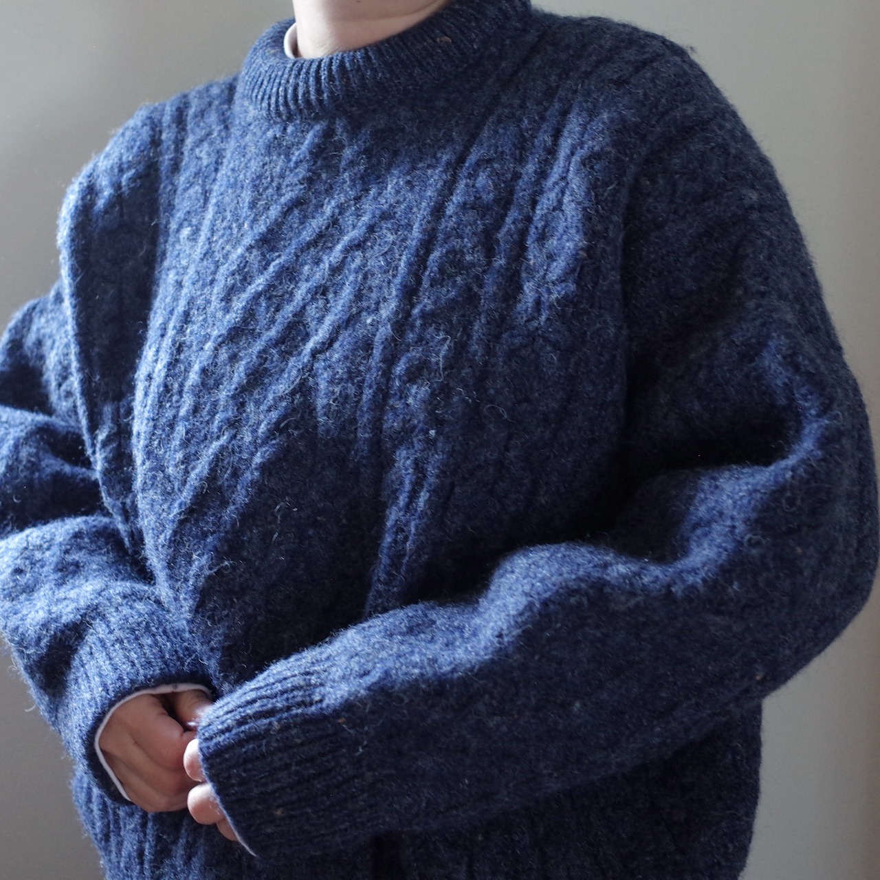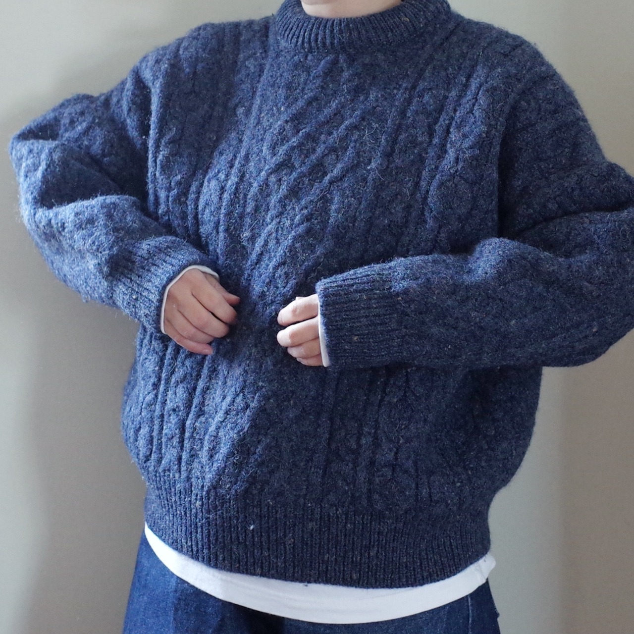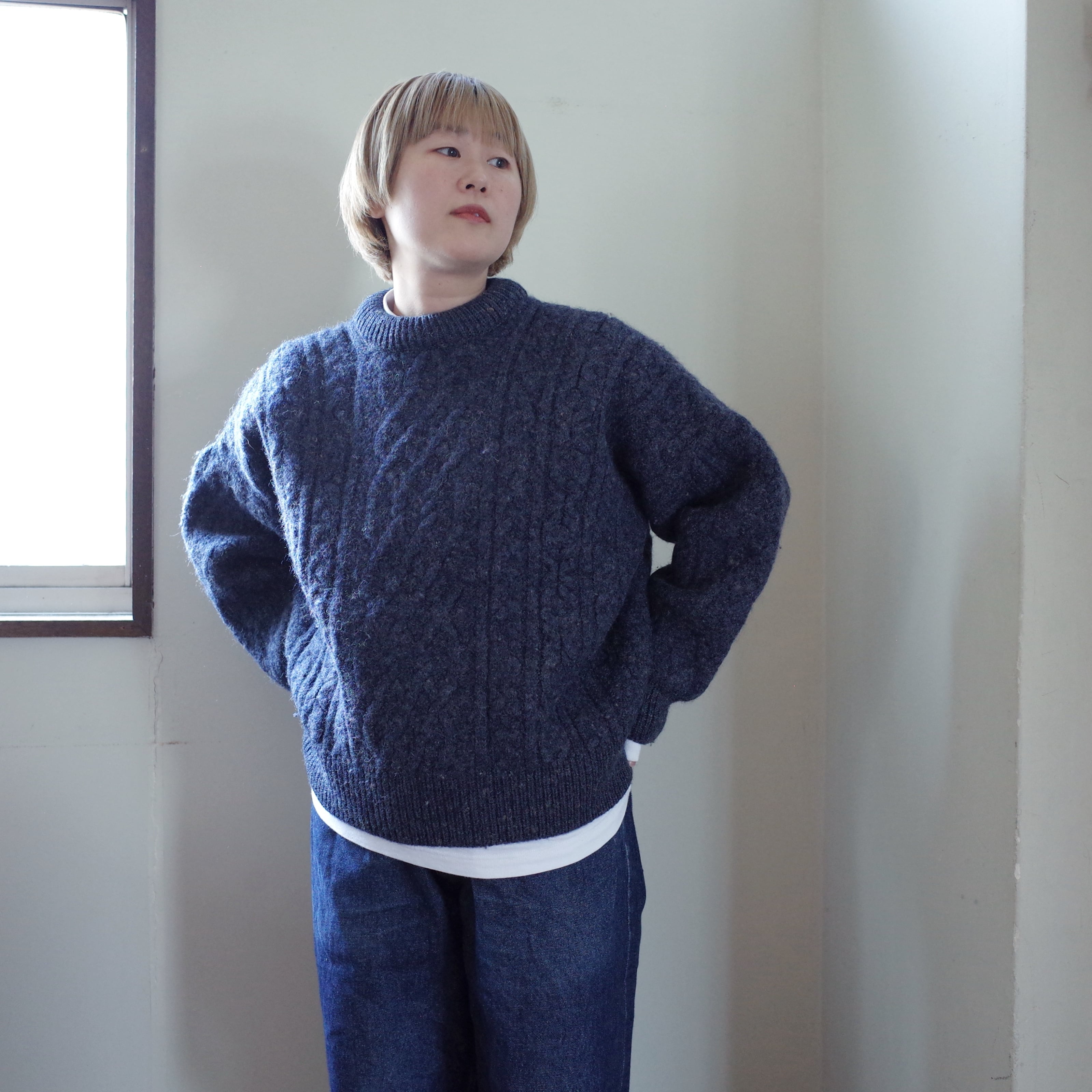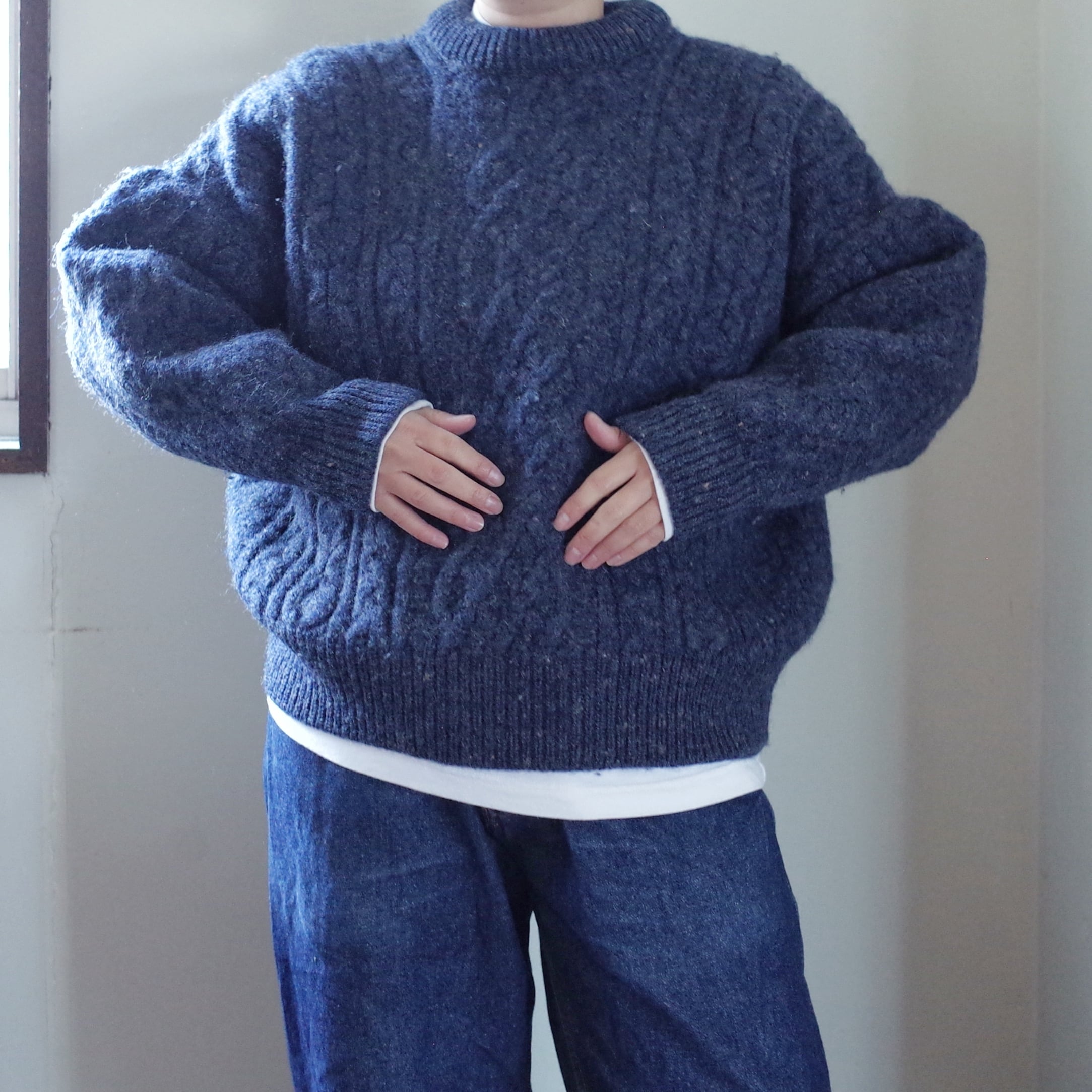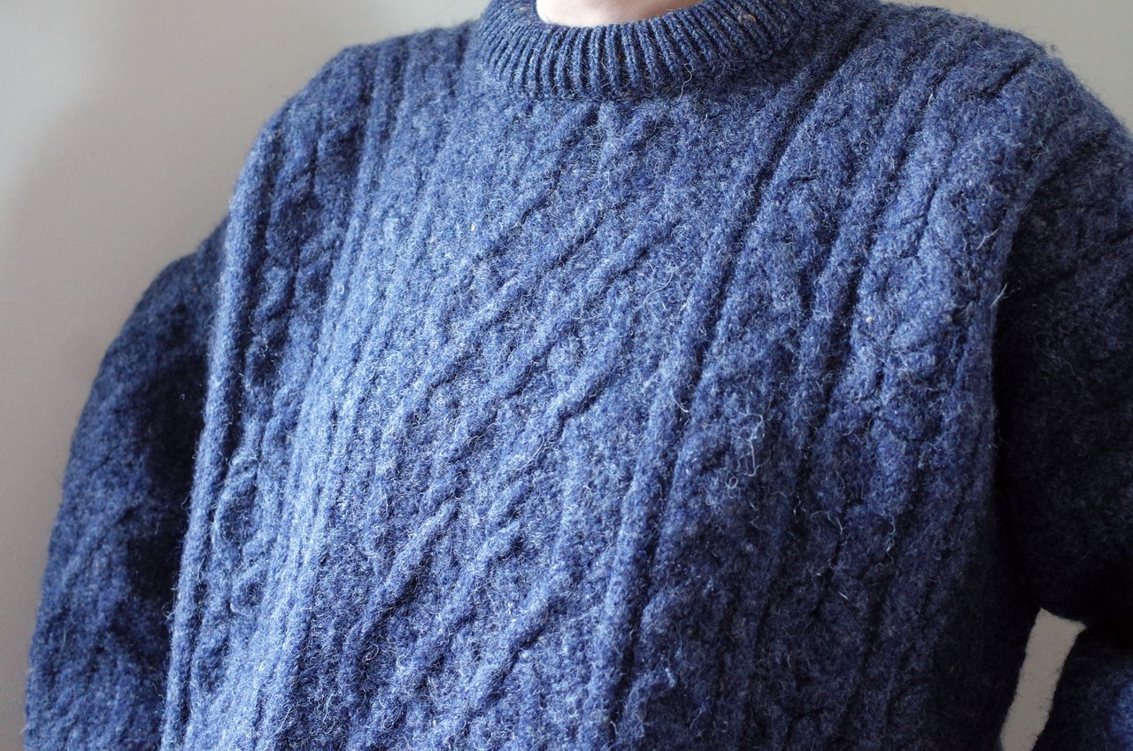 伝統的なケーブル編みが施されたこのセーターは、ぎっしりと厚みがあるのは海に面したアイルランドの厳しい環境でも着られるように作られており、実用性とデザイン性を兼ね備えた一着です。