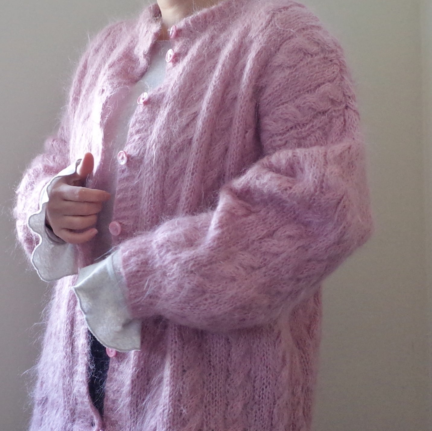 淡いピンクのモヘア素材で仕立てられた、手編みのカーディガン。