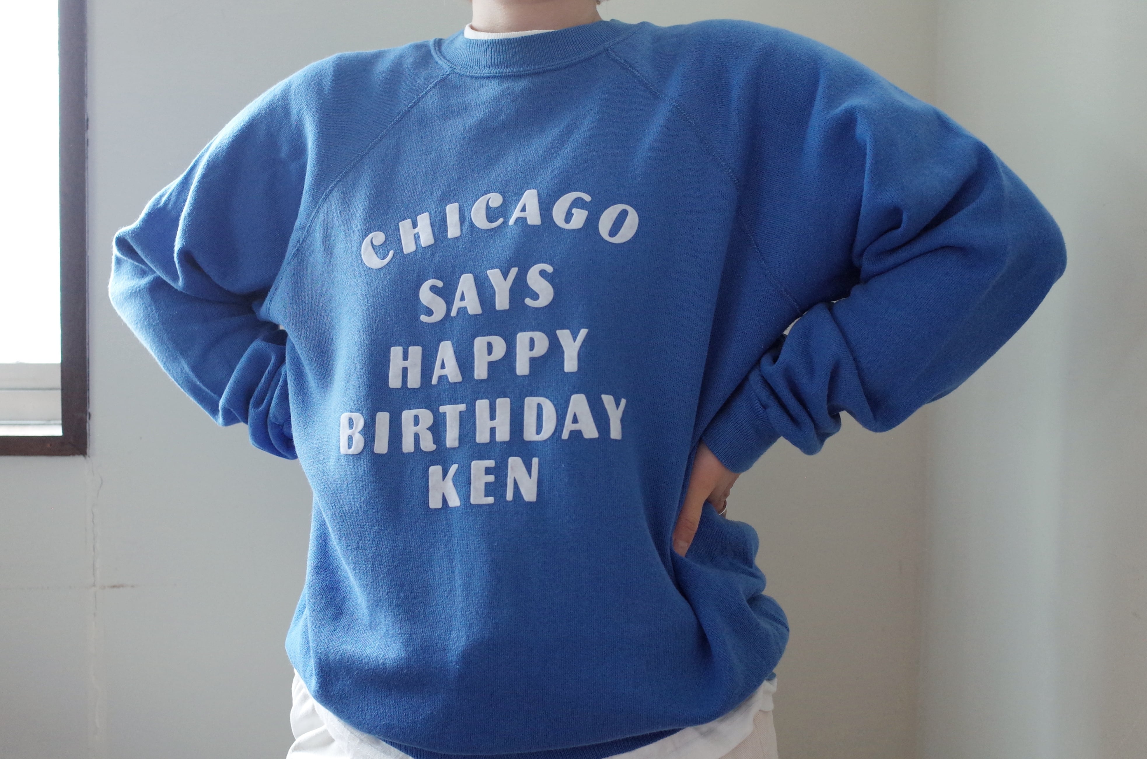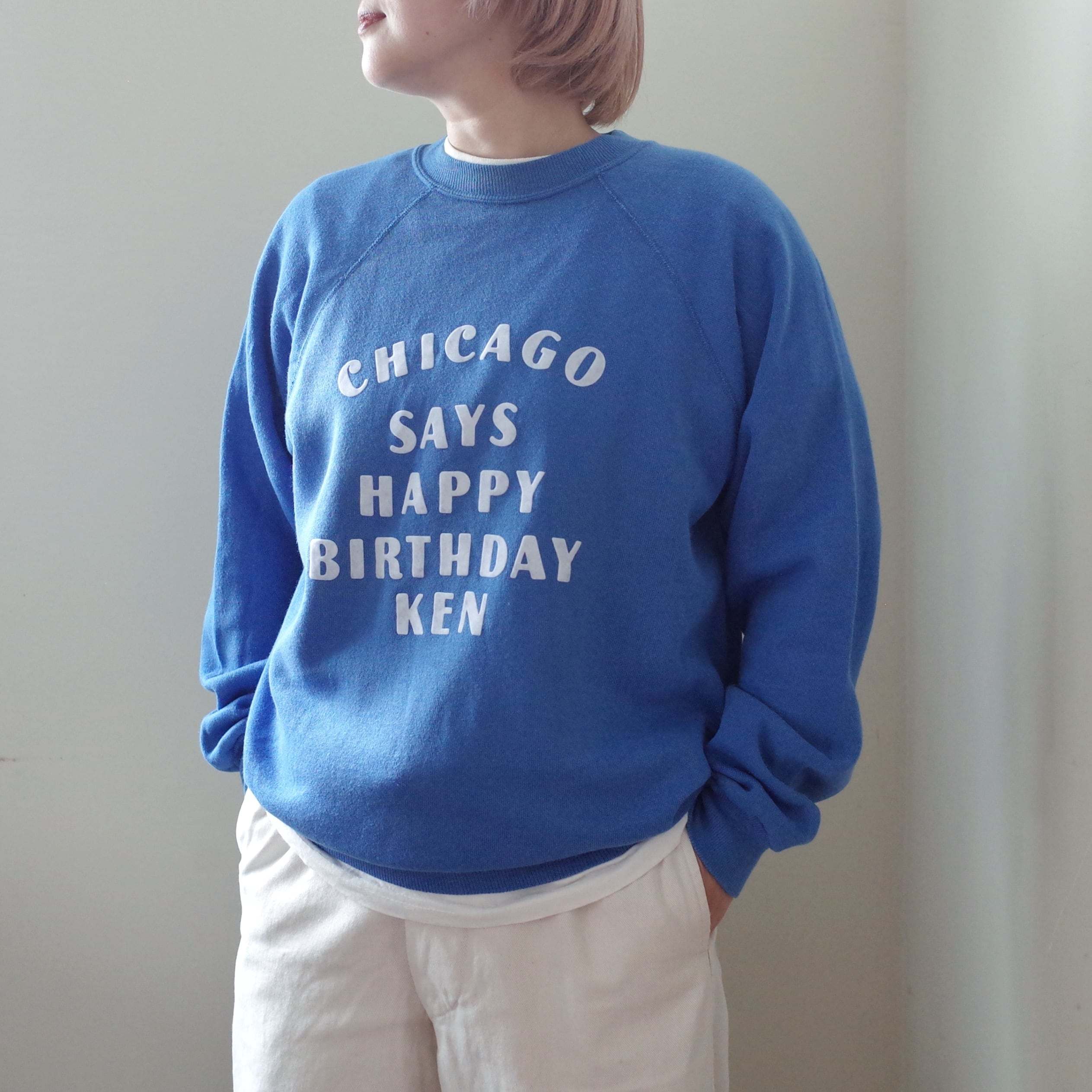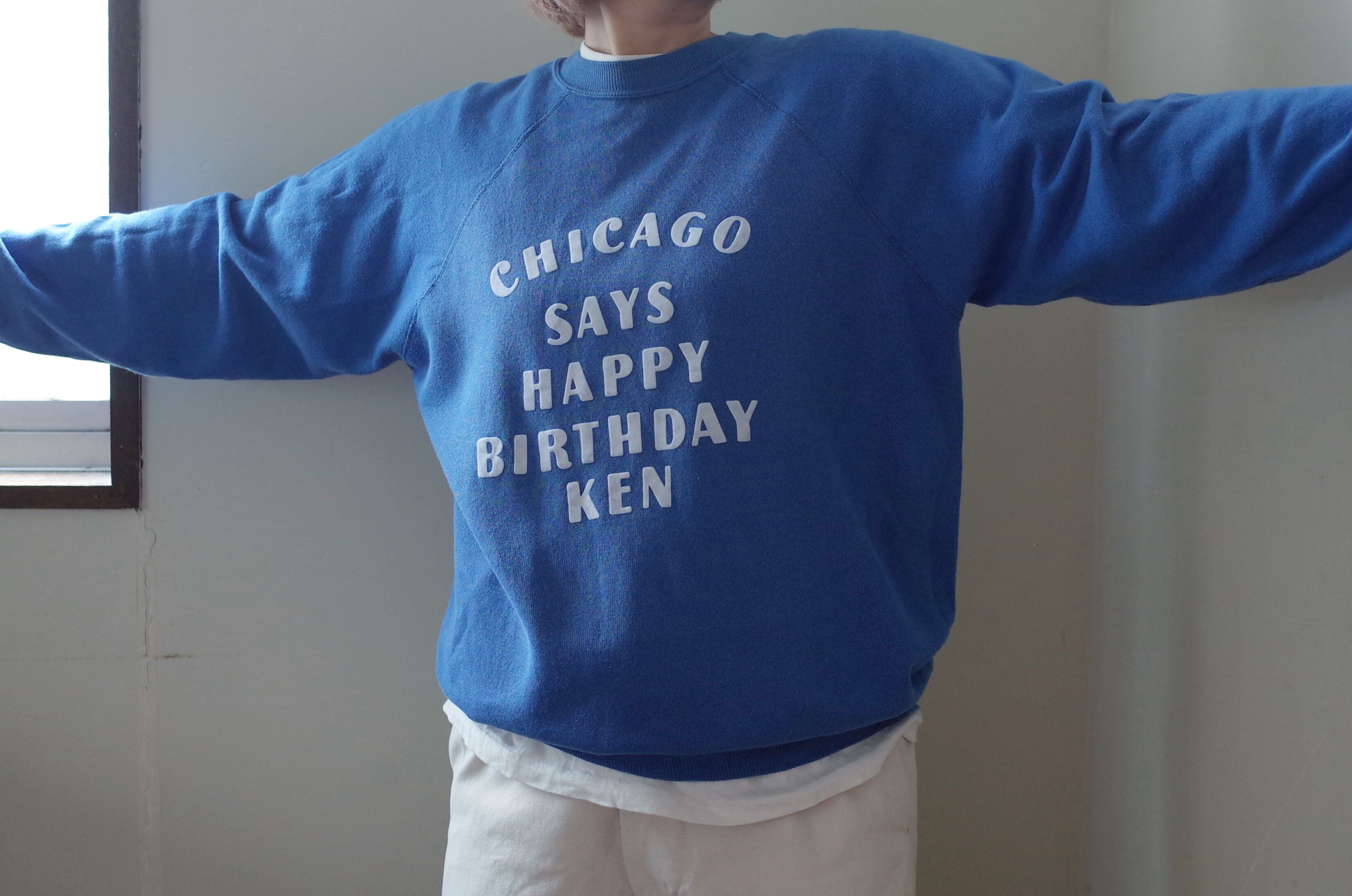 「CHICAGO SAYS HAPPY BIRTHDAY KEN」とインパクトのあるメッセージが書かれているスウェット。メッセージの主語が大きいのも面白いですし、何より特筆すべきは文字の配置のデザインが素晴らしいです。