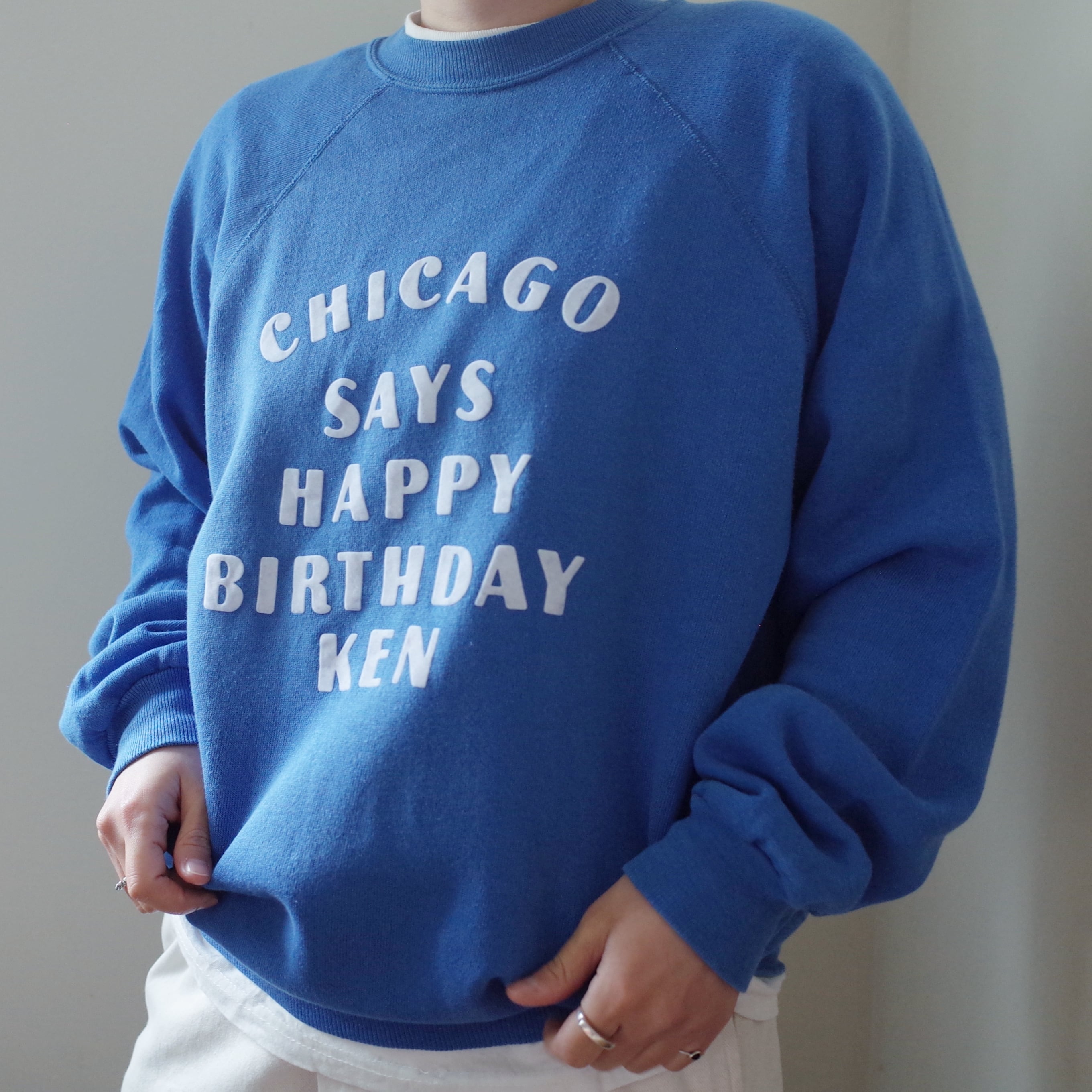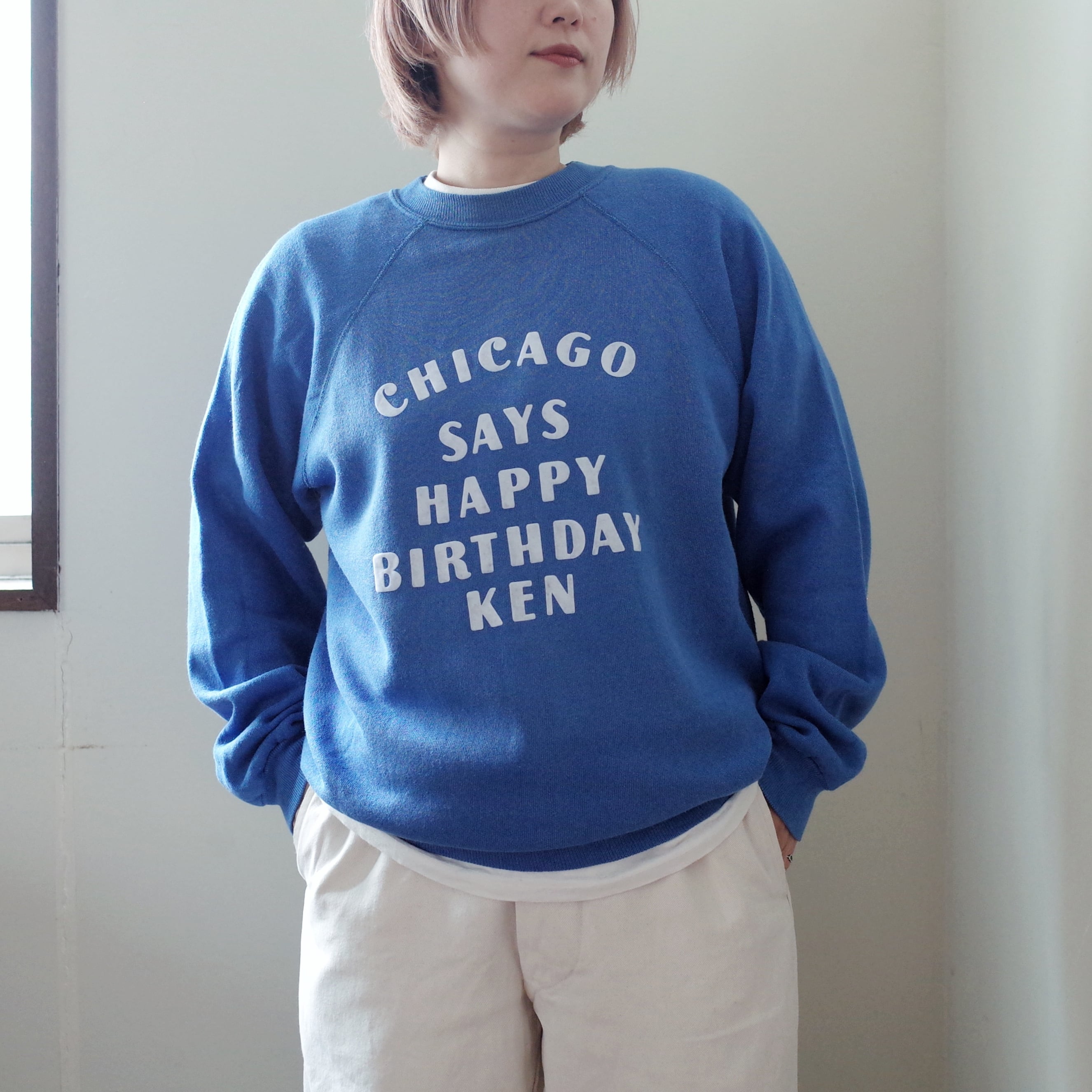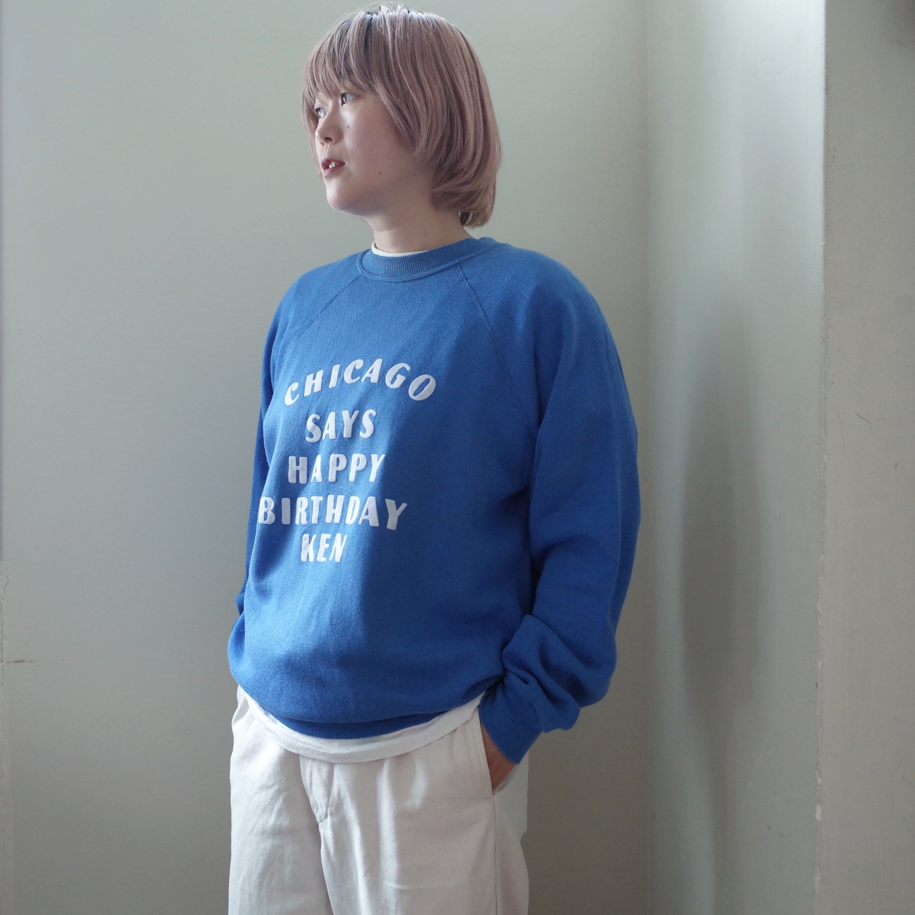 「CHICAGO SAYS HAPPY BIRTHDAY KEN」とインパクトのあるメッセージが書かれているスウェット。メッセージの主語が大きいのも面白いですし、何より特筆すべきは文字の配置のデザインが素晴らしいです。