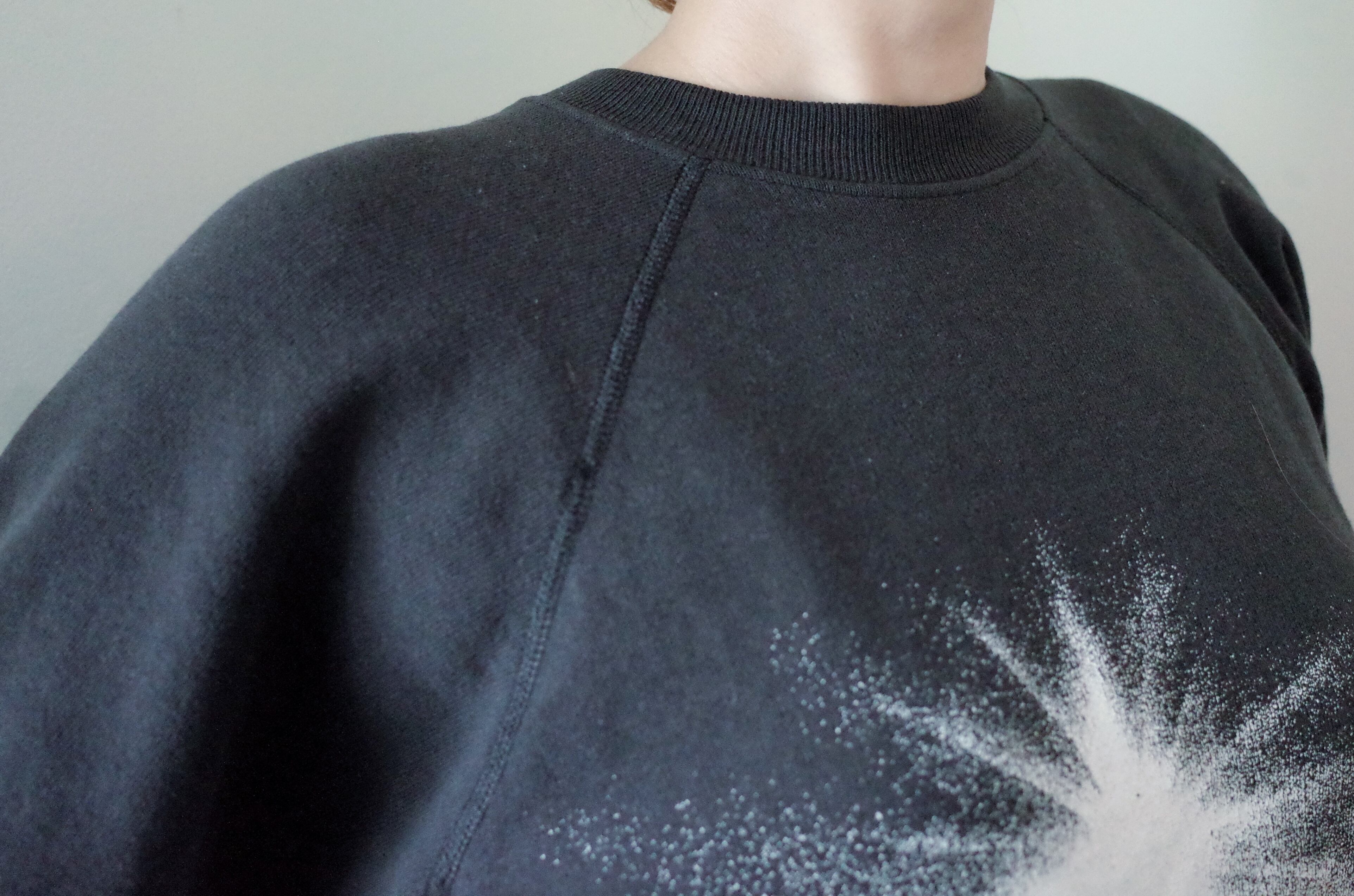HanesのS 34−36(おそらくレディースのS)という小さめのサイズで、肩はラグランに、両サイドに縫い目のない丸胴ボディです。